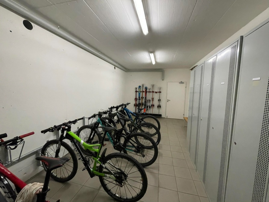 Der Ski- und Bikeraum befindet sich im Untergeschoss. Der Eingang ist neben dem Eingang zu den Wohnungen.